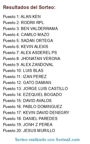 Lista de participantes: JONH Z PEREA, RODRII RPL, ALEX ASDEREL PS, PABLO DOMINGUEZ, JORGE LUIS CASTILLO, KEVIN ALEXIS, KEVIN DAVID DENEGRY, EZEQUIEL BOGADO, IZAN PEREZ, DANIEL PAREDES, BEN VALDERRAMA, ALAN KEN, LUIS BLAS, JESUS MURILLO, SADAN ORTEGA, JHONATAN VERONA, GATO DAMIAN, CAMILO MAZO, ALEX ZANDOVAL, DAVID AVALOS.
