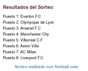 Lista de participantes: Villarreal C.F, Aston Villa, AC Milan, Olympique de Lyon, Liverpool F.C, Everton F.C, Arsenal F.C, Manchester City.