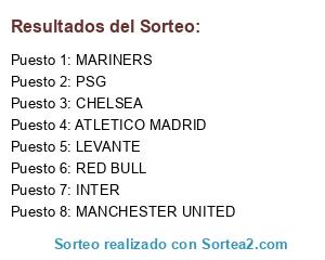 Lista de participantes: CHELSEA, MARINERS, MANCHESTER UNITED, PSG, ATLETICO MADRID, LEVANTE, INTER, RED BULL.