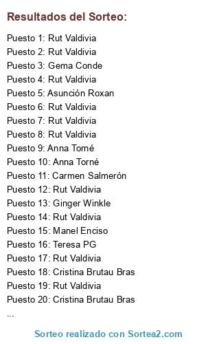 Lista de participantes: Cristina Brutau Bras(3), Rut Valdivia(40), Teresa PG, Mercedes Salmerón(2), Carmen Salmerón(2), Gema Conde, Fran Bernal(2), Anna Torné(2), Ginger Winkle(2), Elena Sánchez, Manel Enciso(2), Asunción Roxan, Fran, Tina y Tino(6).