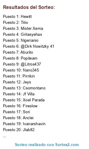 Lista de participantes: Nigerianio, Amenasu, Sori, Rafa GM, Palencia1357, Pirrikin, @Dirk Nowitzky 41, El Paque Isra, JUANSALVADOR, Fermín#27#, Anclei, Jeys, Aburito, Romero88, Csomontano, Ivanarshavin, Ferky, Hewitt, @#46#, Cking, @Litros437, Mister Xema, @aiaiai, Xoel Parada, Dusko, Fireslow, Gritasyehas, Chavo_del_88, @Esteller, Nano345, Titio, Jf Villa, Luisminho.avila, Popiteam, Jlab82, Kraba.