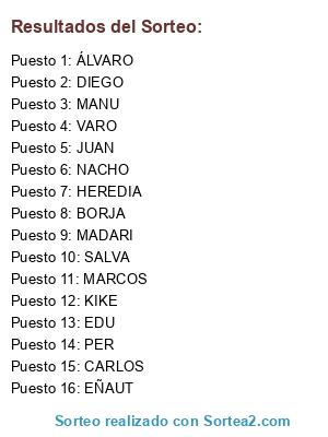 Lista de participantes: KIKE, CARLOS, MADARI, NACHO, MANU, HEREDIA, EÑAUT, JUAN, MARCOS, SALVA, EDU, DIEGO, VARO, PER, ÁLVARO, BORJA.