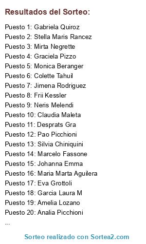 Lista de participantes: Andrea Laita (2 participaciones), Claudia Maleta (2 participaciones), Pao Picchioni (2 participaciones), Analia Picchioni (2 participaciones), Marcelo Fassone (2 participaciones), Monica Beranger (2 participaciones), Neris Melendi (2 participaciones), Amelia Lozano (2 participaciones), Norma Ferrara (2 participaciones), Stella Maris Rancez (2 participaciones), Monica Adami (2 participaciones), Garcia Laura M (2 participaciones), Silvia Chiniquini (2 participaciones), Monica Risso Patron (2 participaciones), Silvia Montanelli (2 participaciones), Colette Tahuil (2 participaciones), Jimena Rodriguez (2 participaciones), Maria Marta Aguilera (2 participaciones), Eva Grottoli (2 participaciones), Carla Roth (2 participaciones), Johanna Emma (2 participaciones), Anabel Vazquez (2 participaciones), Fabiana Rodrigo (2 participaciones), Frii Kessler (2 participaciones), Mirta Negrette (2 participaciones), Yanina Aguero (2 participaciones), Sofi Rodriguez (2 participaciones), Gabriela Quiroz (2 participaciones), Desprats Gra (2 participaciones), Gabriela Cerda (2 participaciones), Graciela Pizzo , Graciela Pizzo.