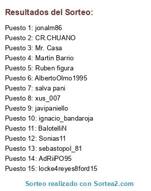 Lista de participantes: javipaniello, AlbertoOlmo1995, xus_007, Ruben figura, Sonias11, ignacio_bandaroja, locke4reyes8ford15, BalotelliN, CR.CHUANO, Mr. Casa, sebastopol_81, salva pani, jonalm86, Martin Barrio, AdRiiPO95.