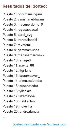 Lista de participantes: daestres, ccm248, rutalking2m, mefugon, lasnenasvintage, yolanda_tyf, mariagpazos, luciapardo, esthertavi, sorodsan, mariaramirez_97, luma_lou, paulagrimonn, ladytrends, carmenchugon, tinkerbell_pat, fatimuky, oxima7, maribelmdn, nolose_arf, merytap97, AN_SAN_DI, marissamarcos72, almuucalzadaa, lety21v, sanita30, andreacmon_, susanatcdat, irenebape, daniielad13, lorena_alonso, macsm333, maca_es, irenukka, irusp, vanishanebhwani, andreafuncia, tranquilobobi, noormansingani, jessica_sk, mandreu10, gemmamunne, silviarubiolopez, anacocol, mamenagustin, mardhernandez, gigitale76, esther_domingo, soukainabelh, xeloesp, fati.smile, liviatication, virgicv17, saramontoyajimenez, ssofiaperez, smediavilla22, noveliha, saramt27, zoraidamente, nieves_fm, mari_bonell, anaromeroubeda, tereespinos, markesa5d, tonietags, anazm83, carol_cvg, solyluna18b, lizamaybe, vir_sanz, mary_foul, rosanius, amandafierrogf, roosanjose, estefipineda, madicg, lamv26, yileniav, lauriris, rosard1974, natillanton, jumaig, speswani, nheken, m.jose29, reyesabascal, nsharoff, macuperdomo_9, gemabrujuladeestilo, divismoytalento, anage8, bels90, estanjana, patriciaovillofertrell, lidiabedman, srta_snowy, mahelvamp, nayita_88, silvi.c, pituca_pg, tonygon27, itgirlcris, isamoran_, laiasiso, yokiriki, ana_alfranca, roalbo62, yaniraesco, alendaalba, claraclaramentealmeria, sabiat31, raquelparradomene, revototal, cmp_76, angarfi68, auri.garciafernandez.5, lauraweaver_l, sgalang06.