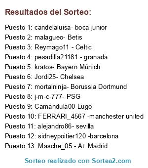 Lista de participantes: Jordi25- Chelsea, FERRARI_4567 -manchester united, Masche_05 - At. Madrid, Reymago11 - Celtic, pesadilla21181 - granada, Camandula00-Lugo, sidneypoitier120 -barcelona, kratos- Bayern Múnich, j-m-c-777- PSG, mortalninja- Borussia Dortmund, malagueo- Betis, alejandro86- sevilla, candelaluisa- boca junior.