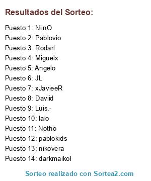 Lista de participantes: NiinO, Notho, Rodarl, lalo, Angelo, darkmaikol, Miguelx, xJavieeR, pablokids, Pablovio, Daviid, JL, nikovera, Luis.-.