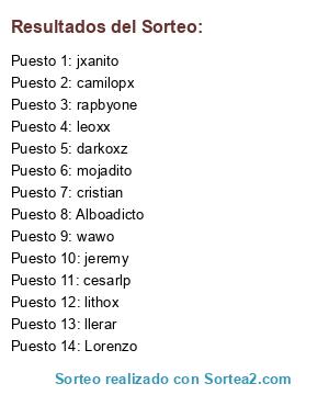 Lista de participantes: rapbyone, llerar, mojadito, jeremy, wawo, leoxx, cesarlp, darkoxz, cristian, jxanito, Alboadicto, Lorenzo, lithox, camilopx.
