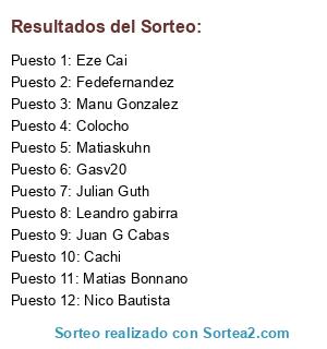 Lista de participantes: Julian Guth, Eze Cai, Nico Bautista, Matias Bonnano, Gasv20, Fedefernandez, Cachi, Matiaskuhn, Leandro gabirra, Colocho, Manu Gonzalez, Juan G Cabas.