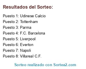 Lista de participantes: Everton, Villareal C.F., Tottenham, F.C. Barcelona, Udinese Calcio, Parma, Napoli, Liverpool.