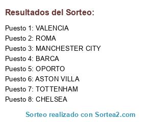 Lista de participantes: MANCHESTER CITY, TOTTENHAM, VALENCIA, ASTON VILLA, BARCA, CHELSEA, ROMA, OPORTO.
