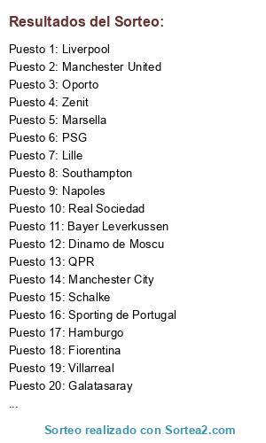 Lista de participantes: Dinamo de Moscu, Napoles, Sporting de Portugal, Villarreal, Liverpool, Atletico, QPR, Wolfsburgo, Marsella, Hamburgo, Southampton, Oporto, Galatasaray, Barcelona, Manchester City, Manchester United, Lokomotiv de Moscu, Schalke, Lille, Zenit, Fiorentina, Real Sociedad, Bayer Leverkussen, PSG.