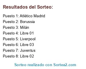 Lista de participantes: Liverpool, Milán, Juventus, Atlético Madrid, Borussia, Libre 01, Libre 02, Libre 03.