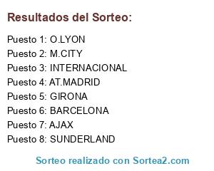 Lista de participantes: AT.MADRID, AJAX, O.LYON, M.CITY, GIRONA, INTERNACIONAL, SUNDERLAND, BARCELONA.