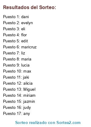 Lista de participantes: Miguel, max, maria, judy, flor, any, miriam, edit, lucia, jazmin, liz, jaki, evelyn, alicia, dani, maricruz, eli.
