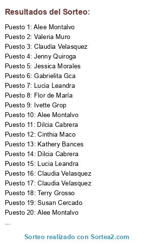 Lista de participantes: Lucia Leandra (14), Wendy Aguilar, Valeria Muro (3), Gabrielita Gca (2), Cinthia Maco, Flor de María, Natalia S. Gamarra, Alee Montalvo (11), Carolina Ds, Karla Doraluz, Claudia Velasquez (5), Kathery Bances (3), Susan Cercado (5), Pamela Abanto, Jessica Morales, Kiary Paredes (5), Dilcia Cabrera (2), Jenny Quiroga (2), Domenica Vasquez (3), Greta Linda, Terry Grosso, Ivette Grop (2), Alexandra Chirinos, Violeta Fernandez (2).