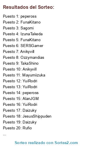 Lista de participantes: Sagomi (3), TakaShino (3), KairiMizukami (4), AlanJGM (8), hanabi (5), Radamanthis (5), GenmaYagyuu (5), Daizuky (4), Mayumiizuka (6), LDBM (4), Ozzymandias (6), BigJorge (6), Rufio (3), YuiRodri (5), Juanjete1515 (1), pepeross (5), SERSGamer (7), IzunaTakeda (5), FunaKitano (6), Anikyvill (6), xDeLosReyeOne7x (4), SeiichiHaruno (6), JesusShippuden (2), DeLtaOneXx (6).