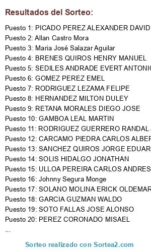 Lista de participantes: ALVAREZ MADRIGAL GUSTAVO ALONSO, ALVAREZ OPORTA ALBERT, AVILA AGUIRRE JOSE LUIS, ARIAS CORELLA EDILBERTO, CALERO ALEMAN CARLOS, CASCANTE VALVERDE ALLAN, CASTILLO CARRION ALBERTO, CECILIANO CAMPOS EILEEN, CIFUENTES GUTIERREZ ANER ORLANDO, DUARTE DUARTE CARLOS EDUARDO, DURAN DELGADO MANUEL A, ELIZONDO RAMIREZ CARLOS FRANCISCO, ESQUIVEL CALVO MARLON, FALLAS ROJAS DANIEL ALBERTO, FONSECA SOLANO VICTOR MANUEL, GOMEZ VALVERDE CARLOS GUILLERMO, GONZALEZ FUENTES JORGE ANTONIO, GONZALEZ MONTERO JOSE RAFAEL, GRANADOS ALVARADO CARLOS STEVE, GUERRERO RIOS NELSON, HERNANDEZ MILTON DULEY, HIDALGO UMAÑA BRAULIO, HINES BOZA DENILSON ENRIQUE, JARA PINEDA FRANCISCO GERARDO, JARQUIN SALAZAR DOUGLAS, LEAL NAVARRETE AARON, LEON LEON JORDY FABIAN, MADRIGAL VARGAS KENNETH ALBERTO, MASIS MORA LUIS GUILLERMO, MENDEZ AZOFEIFA RAMIRO, MOLINA SANDOVAL GIOVANNI, MONTENEGRO RAMIREZ ROBERT ALBERTO, MONTERO MONTOYA WILLIAM ANTONIO, MORA MORA JUAN CARLOS, MORALES ROSALES OSMAN STANLEY, MURILLO CASTRO RICARDO, NUÑEZ MENDOZA ABNER SHUAR, OROZCO VILLALOBOS GERARDO, PORRAS SEQUEIRA JONATHAN ENRIQUE, RAMIREZ ROJAS GILBERTH ENRIQUE, REYES AGUILAR EDDY ALONSO, REYES GARCIA VINICIO, RIVERA MOLINA ROBERTO, RODRIGUEZ VEGA JESUS MARTIN, RUIZ VENEGAS RAFAEL ENRIQUE, SANCHEZ MORA SILVIO JAVIER, SANCHEZ QUIROS JORGE EDUARDO, SANCHEZ ZAPATA EMERSSON JHOSSUE, SOLANO MOLINA ERICK OLDEMAR, SOLIS HIDALGO JONATHAN, SOLORZANO CORONADO JEAN PAUL, SOTO FALLAS JOSE ALONSO, TAPIA LORIA ARAFET, TORRES CUADRA JAVIER, TORRES LEON RONALD MAXIMILIANO, VALLADARES MONESTEL KEVIN ALBERTO, VALVERDE RODRIGUEZ HENRY GERARDO, VARGAS ARAYA BRYAN STEVEN, ZUÑIGA MENDEZ FRANCISCO JAVIER, ABARCA AGÜERO JINNY JESUS, ABARCA ESPINOZA KEVIN ANDREY, ALVARADO ROBINSON JOEL, ALVAREZ EDUARTE JESUS ALBERTO, ARCE CASTRO OSCAR STEVEN, ARIAS PADILLA JORGE LUIS, ARROYO MURILLO ELIOMAR VINICIO, BERMUDEZ VALERIO ALVARO DANILO, BUSTAMANTE URRUTIA NESTOR, CAMPOS CAMPOS STERLING ALONSO, GARCIA ALVAREZ JOSE ARTURO, GARCIA GUZMAN WALDO, GUTIERREZ ZUÑIGA CARLOS WALTER, LEDEZMA MORERA JUNIOR STEVEN, LOAIZA DURAN DENIS, MANZANARES RIVAS ZACARIAS, MATA CORTES NELSY PATRICIA, MORA ZUÑIGA DIEGO JOSE, MOYA BARRIOS LUIS DIEGO, MURILLO ROJAS JOSE GILBERTO, PEREZ CORONADO MISAEL, PORRAS RAMOS ANDRES GERARDO, RETANA MORALES DIEGO JOSE, ROSALES OCAMPO DIANA MARIELA, SEDILES ANDRADE EVERT ANTONIO, SERRANO MENA JORGE LUIS, TREJOS NAVARRO RAFAEL ALFREDO, VARGAS ALVAREZ MAURICIO JOSE, ZUMBADO VASQUEZ RODRIGO, BRENES QUIROS HENRY MANUEL, RODRIGUEZ GUERRERO RANDAL JAVIER, UGALDE CAMPOS GREIVIN ANTONIO, BRENES OTAROLA KAROL VANESSA, ELLIS QUESADA LUIS JAVIER, RIVAS MARIN OLDEMAR, ALVARADO ALVARADO DAVID, COTO CORRALES MARIA ISABEL, ALVARADO SANCHEZ JONATHAN GERARDO, IMBERT BARQUERO ALVARO JAVIER, MORALES CASTRO EDWARD, RAMIREZ GONZALEZ SHARON ISABEL, ALEMAN GUTIERREZ EDWARD JAVIER, ANGULO CONTRERAS ESTIVEN DOMINGO, ALPIZAR LEON ERROL STEVENS, ALVARADO HERNANDEZ MARCO DONALD, ALVAREZ MONTERO GEINER, ARAYA TORRES OSCAR ANDREY, ARIAS ARROYO MARCO ANTONIO, ARROLIGA REYES LUIS MIGUEL, AVALOS GONZALEZ ABNER MESAC, BADILLA JIMENEZ ESTEBAN GERARDO, BARRANTES CHACON KELVIN JOSE, BARRANTES VALERIN JOHEL GONZALO, BERROCAL CHAVES HENRY EMILIANO, BURGOS RAMIREZ MARTIN GERARDO, CAMPOS ALPIZAR CESAR, CAMPOS SALAS OLIVER GERARDO, CARVAJAL PORRAS KENNETH, CASTRO ESPINOZA MARLON, CERDAS DIAZ JULIAN RODRIGO, CHAVES ACEVEDO HEYNER DE LOS ANGELES, CUBILLO MORA GILBERT GERARDO, ESPINOZA MONTANO JACIR ENRIQUE, FERNANDEZ CABEZAS DANNY ALBERTO, FUNG ARAYA RAYMOND ALEJANDRO, GARITA VENEGAS JAVIER EDUARDO, GOMEZ PEREZ EMEL, HERNANDEZ ARCE KEVIN JOSUATH, HERNANDEZ CHINCHILLA CARLOS, HERRERA CASTILLO JOSE PABLO, JARA SANCHEZ JESUS ALBERTO, JIMENEZ CASCANTE KENNETH, JIMENEZ CHACON JOSE ANTONIO, LOAIZA HERRERA GERARD ADRIANNE, LORIA BOZA DAGO VINICIO, LORIA BOZA JASON JOSE, MADRIZ VARGAS LUIS DIEGO, MARTINEZ BERMUDEZ EDGAR ANTONIO, MARTINEZ LOPEZ YONDER, MENDOZA MENDOZA ELIAN ALBERTO, MORENO LOPEZ BRIAN ALFREDO, QUIROS PADILLA ROLANDO, RAMIREZ QUIROS JOSE ABEL, RODRIGUEZ CORDERO ADRIAN, SALAS ARAYA JAIRO JOSE, SANDI MENA DAVID ALBERTO, SOLANO CHAVARRIA MICHAEL, SOTO PORRAS JESUS GERARDO, UGALDE LANZA JUAN CARLOS, ULATE MOLINA JONATHAN, ULATE MOLINA JORGE LUIS, UREÑA CISNEROS NELSON ANDREY, VALLADARES LOPEZ JOSE ALEXIS, VALLEJOS CORDERO JOSE STEVEN, VARGAS RODRIGUEZ DENIS, VASQUEZ ESPINOZA OMAR, VASQUEZ UREÑA JONATHAN, VEGA MENDEZ JOHAN ESTEBAN, VILLALOBOS ALCAZAR KEYLOR, ZELEDON PRADO DAVID GERARDO, AGUILAR CONCEPCION CARLOS VINICIO, ARIAS CHAVES MAURICIO ANTONIO, BADILLA REYES FRANCISCO JOSE, CABALCETA VALERIN HECTOR MAURICIO, CALVO MARCHENA MANUEL JORHANNY, CORDERO GOMEZ HANZEL ANTONIO, CHAVES ARGUEDAS RONNY, CRUZ RIVERA MANUEL, DRIGGS VALERIN EMILIO JOSE, ELIZONDO MENA JOSE PABLO, ESQUIVEL CORRALES ARMANDO GERARDO, FONSECA ARROYO JOAQUIN, GAMBOA LEAL MARTIN, GOMEZ SOTO MAX, HURTADO LUMBI JAVIER JACINTO, LOPEZ ZUÑIGA DENIS JESUS, MATAMOROS VALVERDE JOSE PABLO, MENA MENA OLDEMAR, OROZCO FERNANDEZ RODOLFO ANTONIO, PEREZ ULATE FRANKLIN, PICADO AGUILAR ULISES ANTONIO, RAMIREZ GARBANZO DEYVER ALFONSO, SALAS BOGANTES ROMULO, VARGAS ALFARO GREYVIN, AGÜERO PEREZ JEFFRY ALEJANDRO, ARGUEDAS ESCALANTE CRISTOPHER ALONSO, ARAYA GONZALEZ DAVID JOSE, AVILES VARGAS ISAIAS ALBERTO, BLANDON RAMIREZ ENYEL MAURICIO, BUSTOS BRICEÑO IRKA ALEJANDRA, BRENES SIRIAS CRISTIAN, CALDERON ARCE CARLOS JOHAN, CALDERON CARMONA GUSTAVO, CALVO CALDERON DENIS, CALVO ROJAS JUAN PABLO, CAMBRONERO BRENES DERECK EZEQUIEL, CANALES OCONITRILLO FELIPE DE JESUS, CARPIO ZUÑIGA ALLAN MANUEL, CASTRO HIDALGO JAVIER JESUS, CHINCHILLA ZUÑIGA WILLIAM MARTIN, CORDOBA ARAYA GERSON JOSUE, CORDOBA BOZA JUAN DIEGO, CORDERO SALAS GEISON MANUEL, CORTES ARAYA RANDY SEBASTIAN, DELGADO SOTO JAVIER GERARDO, DIAZ ALVAREZ MARIO JOSE, DIAZ CERDAS CRISTIAN, ELIZONDO CHACON ANTHONY, ESPINOZA CUBERO ARIEL ALONSO, GARCIA MOLINA LUIS GUILLERMO, GODINEZ BADILLA JOHANS ALBERTO, GONZALEZ CRUZ YULEN ALONSO, GONZALEZ UGALDE ALONSO JOSE, GUTIERREZ ARAYA ENDER, GUTIE