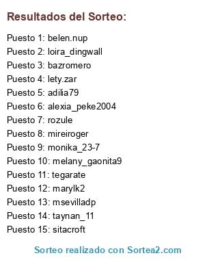 Lista de participantes: lorel27gr, estebanleivalina, lolyvilanova, mar.tonti22, beacvel, mireiroger, mrosagra, taynan_11, concursobe, cristinasabalia, lety.zar, acandiallecina, isa_gr_13, lara_briz2, julia.garque, carol.roger, marijosesafe, vanemellis, vane_tgna, marylk2, esthererasmus, romidiciembre, nuriamg68, mchm_vk, tmr87_, j.vegasgil, seleccionjo, stoneranubis, miriamllb_27, feverlau73, katty_blondyna, silbarto, belen.nup, mfernandezlb, sorayalr, aamaia_8, anairam193, rayas.manchas, evabohada, aniem_27_sukuya, begotza13, gatonegrol, alexia_peke2004, irene_9186, fisiwoman, sandra30trs, kuko.perez, susper2, nperper, marroblesmerino, loira_dingwall, martagarrido77, nhay.gf, bazromero, trufon38, mary_kotton, synthetic_darknesss, diana7099, lu10per, ibiza_rojo, sa-cristi_, sumalaga02, sitacroft, sarabeat, berzas2, luciatraffic, afroditamm, isaacpe, mariafelipa.perez.sanchez, odderley, elfenmrt, Mitiam_floresjardo, luperper2, nurigarciagarcia, canelabrillante, simonval80, cesval43, idalaipg, adilia79, estibaliz.rubia, terejimu, leny.tatye, Lacofe, monika_23-7, casalibrero, aialbizua1, t.merinocamarena, esmeraldafrancosanchez, melany_gaonita9, standby90, tegarate, chusafalcon, msevilladp, kelika.71, cartaparavanessa, pilarpb05, 123alejandria, rufis21, hadadreams, teresita_es, rozule, galletitadecoco.