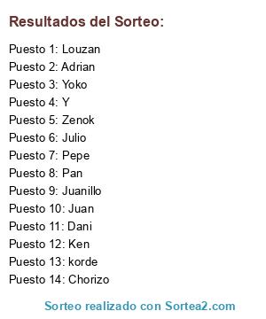Lista de participantes: Korde, Dani, Yoko, Juanillo, Chorizo, Zenok, pedo, Pedro, Juan.