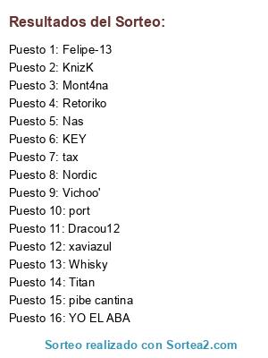 Lista de participantes: Retoriko, pibe cantina, KEY, Titan, Dracou12, Nordic, KnizK, tax, Whisky, Nas, port, Vichoo', Felipe-13, xaviazul, Mont4na, YO EL ABA.
