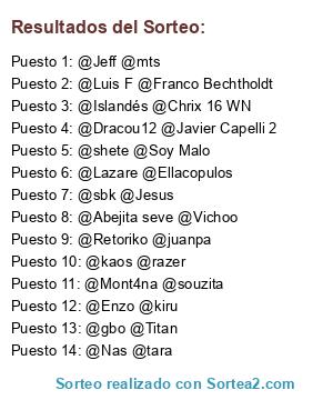 Lista de participantes: @Jeff @mts, @Enzo @kiru, @Abejita seve @Vichoo, @Nas @tara, @Dracou12 @Javier Capelli 2, @gbo @Titan, @Mont4na @souzita, @kaos @razer, @Lazare @Ellacopulos, @Retoriko @juanpa, @sbk @Jesus, @shete @Soy Malo, @Luis F @Franco Bechtholdt, @Islandés @Chrix 16 WN.