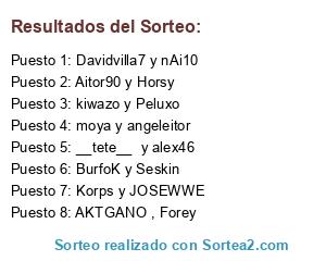 Lista de participantes: BurfoK y Seskin, AKTGANO , Forey, moya y angeleitor, Aitor90 y Horsy, Davidvilla7 y nAi10, __tete__ y alex46, kiwazo y Peluxo, Korps y JOSEWWE.