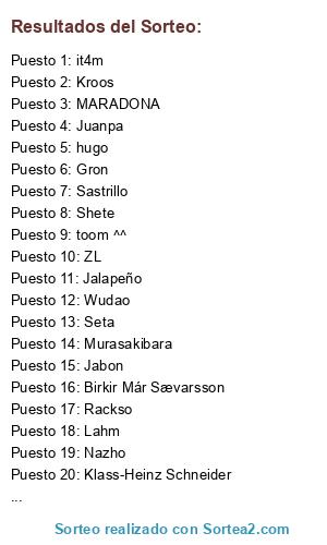 Lista de participantes: Gron, it4m, Wudao, Seta, Zapping, Nazho, Lahm, Sastrillo, Joker, MARADONA, Klass-Heinz Schneider, ZL, zebin, toom ^^, Murasakibara, Jabon, Juanpa, hugo, Shete, Jalapeño, Rackso, Birkir Már Sævarsson, Kroos.