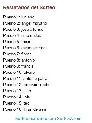 Lista de participantes: Fran de asis, fabio, antonio parra, francis, alvaro, teo, flores, lola, angel moyano, antonio j, kiko, nicomedes, luciano, antonio criado, jose alfonso, carlos jimenez.