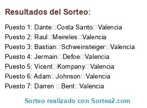 Lista de participantes: Morgan De Sanctis Valencia, Steve Mandanda Valencia, Tranquillo Barnetta Valencia, Walter Montillo Valencia, Jaineil Hoilett Valencia, Josip Ilicic Valencia, Sofiane Feghouli Valencia, Raul Meireles Valencia, Bastian Schweinsteiger Valencia, Filipe Luis Valencia, Joao Pereira Valencia, Antoine Griezmann Valencia, Adam Johnson Valencia, Dante Costa Santo Valencia, Andre Dias Valencia, Vicent Kompany Valencia, Kolo Toure Valencia, Jermain Defoe Valencia, Darren Bent Valencia, Mirko Vucinic Valencia.