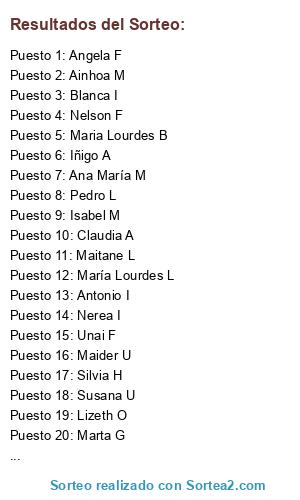 Lista de participantes: Antonio I, Alexander A, Ainhoa M, Alejandra P, Alexis D, Ana María M, Ander Uc, Aner Ur, Andoni C, Ane U, Angela F, Claudia A, M.teresa B, Blanca I, María Lourdes L, Cristina F, Daniel B, David A, Elena G, Eider L, Garazi R, Iñigo A, Imanol P, Roberto D, Iría S, Jesica G, Josetxo B, Nelson F, Julen V, Karmele F, Concepcion M, Susana G, Lizeth O, Esther L, Maria Lourdes B , Lucia A, Maialen A, Maialen V, Maider U, Maria R, Marisa B, Marta G, Esteban M, Miriam G, Maitane L, Mónica U, Rosa M, Idoia M, Isabel M, Virginia M, Naiara R, Iñaki O, Nagore F, Nerea I, Pablo G, Paula G, Pedro L, Regina G, Sabina S, Silvia H, Kontxi M, Ardak S, Salima M, Susana U, Ana L, Unai F, Auyeskul A, Usue A, Vanessa V, Xabat A, Monica O.