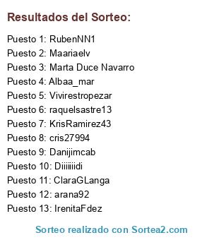 Lista de participantes: 3kariconk3, Albaa_mar, AlbaRocherTresc, AnaCV96, arana92, ClaraGLanga, Criiiis96, cris27994, Cristinadlos, Danijimcab, Diiiiiiidi, EmmaSelvas, ire_iri, IrenitaFdez, KrisRamirez43, laura_tole, Maariaelv, Marta Duce Navarro, NatiQuiros, Noe_RM7, raquelsastre13, RedPathner, rocioca99, RubenNN1, Vivirestropezar.