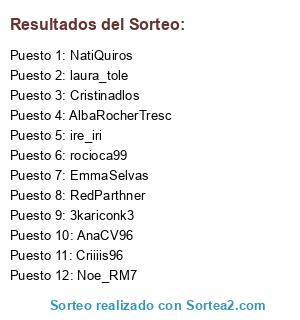 Lista de participantes: 3kariconk3, AlbaRocherTresc, AnaCV96, Criiiis96, Cristinadlos, EmmaSelvas, ire_iri, laura_tole, NatiQuiros, Noe_RM7, RedParthner, rocioca99.