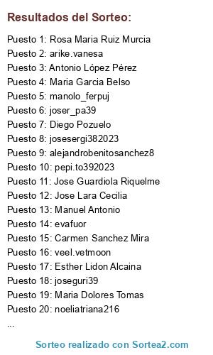 Lista de participantes: Vanesa Alonso Alvarez , Inma Nicolas Rodriguez , Richard Gonzalez Hernandez , Joaquin Amoros Moreno , José Salvador Guardiola Palazon , Manuel Marco , Jose Antoniio Sanchez Selva , Mario Ruiz , Antonio Murcia Alonso , Carmen Sanchez Mira , Antonio Lopez , Manuel Perez , Victoria Pino , Olga Pertusa Amoros , Antonio López Pérez , Lucía Verdú , Manuel Antonio , Raquel Lopez Hernandez , Estefania Ramón , Juan Antonio Benito Sanchez , Rosa Maria Ruiz Murcia , Silvia Cg , Maria Garcia Belso , Juan Carlos Alonso , Merchi Navarro , Денис Качановский , Hamtaro Wendy , Alla Guzavina , Juanfran Gomeez , Antonio Sampere , Filo Grao , Elena Navarro , Fabián Rodriguez Lopez , Ma Mo , Sonia Alarcon , Jose Lara Cecilia , Irene Asencio Alcolea , Noelia Martínez Martínez , Benjamin Chazarra Gimenez , Noelia Sanchez , Jose Guardiola Riquelme , Isidro Sanchez Box , Jesus Roca Ortega , Estefanía Murcia , Francisco Jose Ruiz Arenas , Inma Lician , Beni Sanchez Gomez , Diego Pozuelo , Esther Lidon Alcaina , Maria Teresa Andreu , Vendedor Rapido , Joaquin Espinosa Torrecillas , San Sinmás , Fini Reef , Ojnauj Gi Santi , Carmen Ferrer Requena , Manolo FP , Fini Requena Sanchez , Maria Dolores Tomas , Manuel Valero Cases , madridista8976 , joselito39832 , lectorainvisible09 , salv.a2632 , jgr382023 , juanjo_sg_cabezon , fini_reli , paserjono38 , pau.ser89 , noeser34 , mariaserrapalma , giovannaclaveria , djremember39 , joseguri39 , cara.melito323 , begorafa2 , joser_pa39 , antonio_lp94 , aida_mayordomo , anavgr90 , joseluisdiazgarcia1 , comparsamora , guardiolariquelme , ayudante38 , mamide2tesoros1 , noeliatenzaruiz , pepi.to392023 , arike.vanesa , antonia.martinezcanto , jeromo2025 , viajarenavion40 , juancarlossilva_91 , a.j.s.c.86 , juanito3321 , josegrps39_ , lorenzdrm , vanesa_granada , noelipau34 , sherezadediazsoler , rivesmyriam , cinefilo3923 , paco35665 , jansik31 , yoelpiru , jua73187 , veel.vetmoon , makafans843 , ycc_tkd , yaelkwondo , mercaderestela , josesergi382023 , carmenbenab_91 , agumarps36 , nuriaramoncaballero , lolyhurgo , alejandrobenitosanchez8 , evafuor , manolo_ferpuj , carloslubi , vanesa_alonso_alvarez , federico_el_principito , pauliiita944 , finifr , isabelchazarra , noelia_mar2 , kikistico , cristinalpezgar , noeliatriana216 , ppeem2024 , danielm89_ , menxudiez , ramongz25 , sonriendoalavida39 , sandramora28.