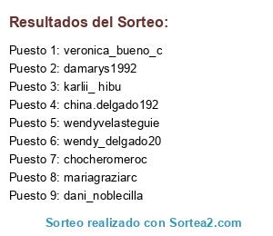 Lista de participantes: mariagraziarc, dani_noblecilla, chocheromeroc, karlii_ hibu(10 participaciones), wendyvelasteguie(4 participaciones), china.delgado192(2 participaciones), damarys1992(10 participaciones), wendy_delgado20(6 participaciones), veronica_bueno_c(4 participaciones).