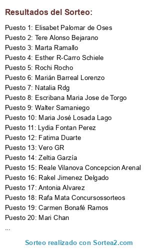 Lista de participantes: Aarón Domínguez, Adrian Cardalda Rial, Alba Sánchez, Alejandra Lopez Estevez, Alvaro Gimenez de Cal, Ana Alonso Alonso, Ana Benet Torrent, Ana Besada, Ana Ci Cas, Ana Días, Ana Isabel Martin Jimenez, Ana Maria Coll Homet, Ana O Belén Depende, Ana Sanjoaquín, Ana Silva, Andrea Fidalgo, Ángela González F, Angelalves Lago, Angeles Falcon, Angelica Salinas, Anna Vera Martinez, Antón Veiga Ferro, Antonia Alvarez, Antonia Leo Munoz, Antonio González, Arturo Arellano, Astrid Vazque Tio, Ave María Muñoz García, Beatriz Abuin Rodriguez, Beatriz Costoya Bello, Beatriz Gil Dones, Begoña Hierro, Belen Abelleira Costas, Belen Viturro, Berenice M, Blan Blanca Blan, Blanca Aide Diaz Gonzalez, Blanca Antúnez, Cacho Vigo, Carla Cbm, Carla Figueira Romero, Carlos Romero Lage, Carmen Bonafé Ramos, Carmen Docampo, Carmen Lorenzo Iglesias, Carmen Montes Graña, Carmen Reguera Blanco, Catalina Longo Lorenzo, Charlie Vigo, Chica de la Siesta, Christian Samaniego, Chus Alfonso Meniño, Chus Noya, Claudiia Castro, Con Eme de Mariana, Conchi Badiola Glez, Cristina Adell del Oro, Cristina Martinez Garcia, Curro Cañete Leyva, Damian Samaniego Chavez, Deisy Rodriguez, Diego Nei, Dolores Maneiro Ribeiro, Dolores Soler Rodriguez, Edelma Elena AG, Elena Paredes Alonso, Elisabet Palomar de Oses, Elizabeth Azcárate, Emilio M. Luna, Enma Lopez, Erika Yazmín Aguirre, Erzsébet Szabo, Escribana Maria Jose de Torgo, Estela López Rodríguez, Esther Jerezano Quero, Esther Pineros Sanchez, Esther R-Carro Schiele, Eva María, Eva Maria Cabadas Caloto, Eva Pérez Díez, Fatima Duarte, Fatima Lema Alejandre, Feel Free Festival, Festas de Nuestra Señora e san Roque, Fiesta joven fin de año Mercantil Vigo, Francisco Jose Toribio, Francisco Paco Santos Gtz, Gabriela Mercado, Gerardo Santos Gtz, Giovanna Chapela, Gonzalo Esteban, Grupo Viartv, Guillermo Rey, Helvia Laura De Paredes, Inmaculada Quiñonero, Irene Martín Arcos, Iria CM, Iria SCh, Isabel Fernandez Fernandez, Isabel Rodríguez Meno, Isela Sanchez, ITALIAN STYLE radio show, Ivan Dominguez, Ivana Saínza F, Jasmine Serra Montes, Javier Cebreiros, Javier Pérez Gómez, Jenny Toro, Jhoana GR, Jose Antonio Beiro Chechu, Jose Antonio Rodriguez, José Manuel Fernández Fernández, Jose Núñez, Jose Ramón Bernabeu, Juan Franco Rosa, Juliana Pazos, Kagi Vasme, Katia Ladrón de Guevara, Lamarque Nathalie, Lau Ladelri, Leticia Calvo Pardilla, Lidia Aguilar, Loli Docampo Diéguez, Loli Marcelino Gil, Loly Llano, Lourdes Barreiro, Lucero Moncada, Lucia Luque Roa, Luzdivina Arguelles Vega, Lydia Fontan Perez, Macarena Makiald, Maeva Sineiro, Maite Gomez Mazon, Malena Cepeda Fuentes, Mar Suárez, Marcos Dominguez Vila, Marcos Ramos, Mari Carmen Castro, Mari Chan, María BM, Maria Carolina Carvalho Amaral, Maria Cruz Chavez Duarte, María Del Mar Arce Perez, Maria Elena Gómez Martínez, Maria Iglesias, Maria Ines Lopez Volpe, Maria José Losada Lago, Maria Llorente, Maria Martinez Rodriguez, Maria Pérez Pazos, Maria Perona, María Rosa González, Maria S Gonzalez Pi, Maria Sonia Abalo Araujo, Maria Wasmer Romero, Marián Barreal Lorenzo, Maricruz Villaescusa, Marilo Asbe, Marimar Vicente, Marina Meaños, Marisa Sousa Perez, Marisol Troncoso, Marta Nieto Fernandez, Marta Ramallo, Marta Silvia Muñoz Martínez, Martha Pastorino, Maruxiña Maruxiña, Mary Conde Berdullas, Mary MA, Mercè Soriano, Meri Meijueiro, Mhinney Mora, Miguel Jorreto, Miguel Mardes, Mila Gómez, Milagros Hera Mínguez, Míriam Patiño Rey, Monica Dominguez Vieitez, Monica Gonzalez Mata, Monica Lastra Cantabria, Mónica Nogueira, Natalia Rdg, Nerea Amigo Garcia, Nica HerPer, Noe Duarte Iglesias, Noelia Aragunde, Noelia Mellado Zapata, Noelia Olmo, Noelia Vazquez Rivera, Nuria Santos Resúa, Paco Esteban, Paco González C, Patricia GB, Patricia Gimenez, Paula Santos, Pedro Alfaro Rodríguez, Pilar Barbero Martinez, Pili Angueira, Radio Activa . fm, Rafa Mata Concursossorteos, Rakel Jimenez Delgado, Raquel Gómez Chacón, Raquel Marcos Villamañán, Raul De Las Heras, Reale Vilanova Concepcion Arenal, Rebeca Flores, Rebeca Rebeca, Rebeca Villar, Reyes Mariscal Blanco, Ro Cío, Rochi Rocho, Rocío L Vigo, Rocio Ortega, Rocio Reina, Rocio Sanchez Jimenez, Rommy Bringas, Rosa DSantiago, Rosita Rosa Rosilla, Rossy Durán, Rosy Flores, Ruth Ac, Sandra L. Muñiz, Sara Carballo Luengos, Sara Espejo, Sara Muñoz Gil, Sara Veiga, Sergio Alberto Castro Nuñez, Silvia López Lería, Silvia Macías, Silvia P. Vence, Silvia Rojo, Silvia Soutullo Vázquez, Silvia Vidal, Silvina Dominguez, Sonia Balo Loba, Sonia Montero, Stefania Hilson, Tere Alonso Bejarano, Toño Escudero, Vanessa Salgado, Vero GR, Victor Rubio Gómez, Vinoteca Luya, Virginia Gonzalez Espinar, Walter Samaniego, Xose Comesaña, Yolanda Boveda Diaz, Yolanda Criado, Yoli Muffins, Zeltia Garzía.