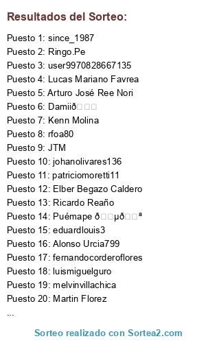 Lista de participantes: El_Politiquero, 🆃🆄🆁🆃🅾🅺🅴🆁, Puémape 🇵🇪, Victor Nomberto Caba, Ivan Nieves Revoredo, shavidelacruz, Elber Begazo Caldero, ABERSEKER, Omar Aramburu, elbarbaspinturaymas, JTM, miguelmontielg, diegolas, Martin Florez, Ruben Dario Puente D, RubenRCO, johanolivares136, Ringo.Pe, Carlos Avila, Damii🌚, Sergio A. Serrano Flores, vilelajuarezernesto, user9970828667135, Arturo José Ree Nori, Zamok M., Ricardo Reaño, rfoa80, Nitram Aicnarf Ocehc, Kenn Molina, Gino Alvarez Obeso, Juan Eduardo Salas R, Friedrich, Josue Alvarado Bonilla, patriciomoretti11, Sergio Reyna, user1401175718632, Tip TI, Jóse Parra Roman, Richard Odiaga, Rodrigo Velarde, Rockrose, Giancarlo Revilla An, CJ Garcia, Jose Manuel, Lucas Mariano Favrea, Jorge Sanchez, Bruno Mares838, Alonso Urcia799, Ocēlōpilli, Luis Miguel Gutierrez Rojas, xavierzabal, colomasardi, christianmvc, abeluperdi, guss.mart, ab.se05, lomi7917, francotirador367, idarparraocampo, carlitosf17, jorgelazarte14, jfarfan91, eleine1060, cesarbeltran.ch, eduardlouis3, jhonatancastro.ark, zekagamers, r7vibes, alex.aysg, jorgef6970, dafo_21, sergioa.durand4, since_1987, davemontalvan, mr.lynx_minis, albto_, fernandocorderoflores, jose.larrea15, luismiguelguro, karlapretell, melvinvillachica.