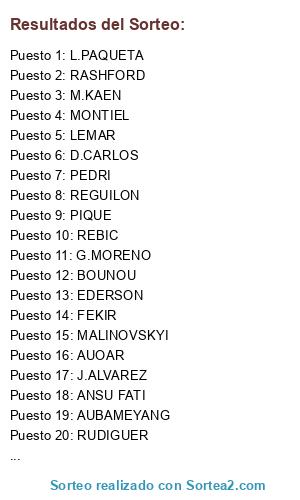 Lista de participantes: EDERSON, BOUNOU, PIQUE, RUDIGUER, D.CARLOS, MONTIEL, MAZRAOUI, REGUILON, PEDRI, AUOAR, FEKIR, L.PAQUETA, LEMAR, S.SIMON, RASHFORD, ANSU FATI, REBIC, MALINOVSKYI, G.MORENO, J.ALVAREZ, M.KAEN, AUBAMEYANG.