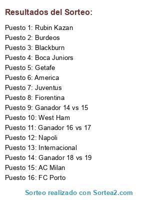 Lista de participantes: AC Milan, America, Internacional, West Ham, Ganador 16 vs 17, Napoli, Getafe, Blackburn, Boca Juniors, Ganador 14 vs 15, Juventus, Ganador 18 vs 19, Fiorentina, Rubin Kazan, FC Porto, Burdeos.