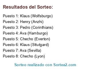 Lista de participantes: Ava (Sevilla), Klaus (Wolfsburgo), Pedro (Corinthians), Checho (Lyon), Henry (Anzhi), Checho (Everton), Ava (Hamburgo), Klaus (Sttutgard).