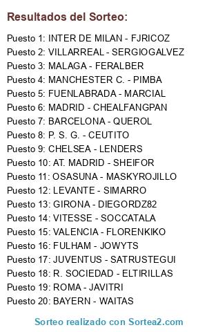 Lista de participantes: VILLARREAL - SERGIOGALVEZ, BAYERN - WAITAS, ROMA - JAVITRI, MALAGA - FERALBER, FULHAM - JOWYTS, CHELSEA - LENDERS, JUVENTUS - SATRUSTEGUI, AT. MADRID - SHEIFOR, VALENCIA - FLORENKIKO, VITESSE - SOCCATALA, INTER DE MILAN - FJRICOZ, BARCELONA - QUEROL, P. S. G. - CEUTITO, R. SOCIEDAD - ELTIRILLAS, MADRID - CHEALFANGPAN, FUENLABRADA - MARCIAL, MANCHESTER C. - PIMBA, GIRONA - DIEGORDZ82, OSASUNA - MASKYROJILLO, LEVANTE - SIMARRO.