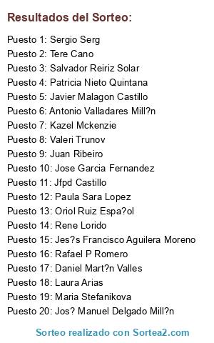 Lista de participantes: Jessica Galeron Iba?ez, Alejandro Roma Garcia, Mihaes Dorel Giani, Juan Antonio Benito Sanchez, Lola Felguera Torrijos, Chema RS, Laura Salinas Sim?n, Roberto Rom?n N??ez, Alex Subires Sanchez, Andres Steven Moreno Arias, Jose Maria Calero Coso, Jose Antonio Siria Beaterio, Tania Aparici, Nico Manzanas Bustamante, Gaspar Escriche Maikes, Marco Antonio Lozano P?rez, Jesus C?rdoba Amador, Ber Ny, Fabian Humberto Vasquez Lemus, Yenny Santana, Laura Perez Pitarque, Samuel Mu?iz Vidal, Sergi Garcia Gatxi, Ester Mosquera, Vanessa Redondo Martinez, Santy Alonso Calleja, Adriana Sanz Bernal, Noelia Garc?a, Oriol Go, Jose Angel Vadillo Escudero, Pablo Pablito, Ivan Ferrari, Fran Orive Carrasco, Oscar Gonz?lez Gonz?lez, Lucia Angueira Brea, Manuel Fito, Capitan Cavernicola, Isa Guadi?n, Hell Clemente, Lluis Quero, Jose Campillo Suarez, Pozuelo Eloy, Juan Juan Mataix, Sergio Elena G?mez, Enrique Rosell, Jose Jacobo, Juan Jimenez Dominguez, Diee Martinez Martinez, Abel Rodr?guez Y?nez, Eugenio Ruiz Delgado, ?lex Hdez Cas, Basilio Molinero Sanguino, Lidia Tacero Orgaz, Mahmoud Ahmed Tatari, Jose Luis Fernandez Valero, Felipe Gonzalez Gomez, Angelotti Caballero, Juan Antonio Prieto, Almudena Pe?alosa, Manuela Vivas Dominguez, Andrew Vener?, I?aki Vi?es Pujol, Juan Jes?s Garrido G?mez, Mario Chp, Ada Francisco Ca?ete, Alberto Sanchez Santos, Pablo Serrano Claros, Dar Liil Yankee, Rafa Garcia, Laura Portales Matinez, Jos? Antonio G?mez L?pez, Vasyl Melnyk, Marian Santacreu Crespo, Miguel Pacho, Gabriel Balest, Lucia Mora Melo, Daniel Iglesias, Miren Iba?ez, Sergio Perez, David Ruyman Daza Casa?as, No?mie Clemente, Francisco J. Martin, Juanmi Barbosa, Toni AC, Jonas Dp, Joni Rodriguez, Miguelangel Freire de Castro, Basi Lio, Miguel Luque Mesa, Isma Mart?nez Nicol?s, Francisco Javier Prieto Quintana, Aar?n Pilares de Egea, Miguel Barron Sanz, Ram?n Calvo, Manu De Miguel Horcas, Erika Yepez Encalada, Ruben Dominguez Sanchez, Rafa Soria Blay, Jos? Manuel G?mez G?mez, Juan Carlos Mendez Herrera, Paula DM, David Gil Sanchez, Santi Castro, Jose Antonio Lopez Nortes, Lopezz Ampa, Antonio Maldonado, Carlos Garcia Baldajos, Miguel Angel Ruiz, Angel Garcia Bernabeu, Vanesa Garc?a Luque, Lukas Rodriguez Crespo, Jesus G. Martin, Francisco Peregrina Gomez, Jfpd Castillo, Fernanda da Silva, Tuko Bcn, Laura Calero Tabascar, Alejandro Santos Canas, Esperanza Fuentes Ubeda, Gonema V Galvez, Ruth Alvarez Prats, Guillermo Garcia Rodelgo, Alicia Rey, Diego Vijande Granda, Jose Aguardientes, Carmen Popescu, Rosa Mari Reig Pastor, Walter Acosta, Angels Figueras Querol, Ivan Diaz, Joaqu?n Gomez, Bryan GGarc?a, ElisaBeth Senties, Ramirezrez Hombre De Rancho EErnesto, Jose Azor, ?ngel Herreros, Pere Lopez Soriano, Oscar Pe?a Belmonte, Kily Kily, Oskar MiniJosu, Carmen Ruiz, Xandra Orgaz, Day B Hache Ele, Zaira Nu?ez Ruiz, Narc?s Figueres Fenoy, Irene Ca?ete Estrada, Marisol Cardenas Gonzalez, Honorio Vega Santana, Javi Ramos, Ivan Gil Ochovo, David Diaz Gomez, Eliseo Guijarro, Juan Jos? Garcia Benitez, Carlos SJ, Conchi Caro Herrero, Sara Perez, Luisa Garcia Ayala, Covadonga Gonz?lez Dilaurenti, Alex Mositz, David Garc?a Ojeda, Jose Carlos Garcia, Arturo Marques Torres, Marc Mosqueda Rodriguez, Dennis Fabian Caicedo Lara, Alberto Llorente Mora, Alex Pascual Gonzalez, Cristian Laura Del Aguila Be?afiel, Patricia Diaz Pardo, Alejandro Garcia, Pablo Fitt, Ana Mar?a Guti?rrez, Susana Gomez Fernandez, Chyno Javier, Ximo Santana, Moises Balsells Escofet, Julia Alvarez Villanueva, Jarek Palomino, Nadia Borrega, Jey Yuste, Dashalcri Plasencia, Susanna Oda Gacia, Rosa Mari Siles, Rub?n Arribas Sobrino, Fabian Paz, Vicente Cazorla Gil, Gabriel Gallardo Vargas, Luis Campillo Martinez, Jose Manuel Rodriguez Mosteiro, Victor Garcia Rodriguez, Andres Saiz, Marcoane Doru, Carlos Villar Cano, Ivan Kwk, Emi Torres, Elenita Valero, Alvaro Reinoso Granda, Jesus Jimenez Tejeda, David Calomarde, David Gilabert Bru, Manuel Mar?n Robles, Viviana Constanza Quesada Vargas, Julio Pe?a Panduro, Araceli Martinez Yano, Raul Royo, Daniel Coll Lopez, Jose Luis Daus, Yessica Chavez Vicelsa, Tati Leal, Rosa Valle Alapont, Pepi Iguiniz, Vicente Ortz Bascu?ana, Jose Luis Garcia ?lvarez, Esmeralda Barroso, Marcelo Ser?, Jose Luis Mu?oz, Francisco Javier Sosa Arana, Silvia Arandojo, Sergio B. Megias, Fernando Torres Reines, Yaser EArribas, Jose L. Gamboa, Laura Laredo E, Luis Miguel Gonzalez, Vikingo Verde, Ismael Gonzalez, Jose Tocon Rivera, Miguel Lancho, Jos? A. Valdivia Gallardo, Am?rica Ruiz, Tania Gil, David Caba Bravo, Cristina L?pez, Sheila Sheila, Deker Deker, Laura Medina Beltran, Javier Moreno Lopez, Ana Del Carmen Caballero Sarmiento, Mariano Puras, Javi Tarin, Laura Arias, Maria Perez Lago, Sergio Gonz?lez Garc?a, Tito Martin, Francisco Obtres, Jordi Belmonte, Roberto Minguez, Javier Galiano Fernandez, Jose Rtdetail, David Ma, Eva Landesa, Mary Glam, Juan Ramon Flores Murillo, Estela Bellido, Alberto Valero, Salva Mendiz?bal, Jose Manuel Navarro, Zeus Garcia, Jose Segura Maimo, Roberto Carnicero Diaz, Sebastian Clavijo, Carlos Ramirez Alfaro, Sara Go, Javi Wolf, Jose David Marquez Rodriguez, Tom?s S?nchez Garc?a, Henry MoGrey, Javier Prieto, Jesus Fernandez, Paula Sara Lopez, Ally Enjamio, Spartan Marco Antonio, Jeniffer Johana Pe?a Rueda, Felix Otero, Raul Busati, Lidia Fernandez Gonzalez, Eric Estas Que Sii, Roberto Lopez Alvarez, Curro Osuna, Roberto Fernandez Grande, Enrique Jimenez Aguilar, Daniel Gomez Ranz, Cristina A??n Rodr?guez, Jessica De Andres Santana, Ismael Hdez Hdez, Javier Dominguez, Maria Oller Gonzalez, Angel LM, Lara Belmonte Mart?n, Fernando Gonzalez, Olga Ramos Zamora, Jose Luis Romero Jurado, Juan Manuel Torres Paterna, Javier Malagon Castillo, Pedro Antonio Ma?as Calderon, Pebri Rios, Magdalena Sanchez Mendez, Hernandez Jorge, Tonibdnboxing Ca?adas, Maite Gonzalez, Francisco Javier Gata, Juan Manuel Salas Martinez, Jose Casanova, Marcos Rueda Cordoba, Israel YCristina, Genis Leyva Cuevas, Nacho Binigaus, 