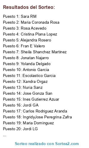 Lista de participantes: Roberto Piñera García, Rosa Acevedo, Sergio Bardom, Maria Dominguez, Rosa Dominguez, Pedro Rivero, Tatiana Conejo, Anma LG, Jose A Martinez, Fany Vieira, Toñy Navarrete Martinez, Rosa Maria Sanchez Noves, Maribel Rosa, Raquel Sancho, Víctor Manuel González Vivas, Antonio Garcia, Juan Rubio, Yolanda Delgado, Alexandre Xavier Ors Pascual, Laura Espada Vera, Javier Beltran Carceller, Jose Luis Gonzalez, Lucas Ada, Jordi GA, Yolanda Gutiérrez Gómez, Jose Rosary, Bibi Madrid, Isabel Gragera, Javier Ortiz, Juan Carlos Rubio Prestel, Jessica Zuñiga, Sara RM, Elo Ramo, Eva Pepiol Martinez, Laura López Lería, Isabel Maria Martos, Miguel Angel Lopez Perez, Loli Alcaraz Fernández, Maria Iluminada Martinez Garcia, Antonio Corbacho, Nuria García Vilardell, Felipe Garcia, Tamara Oliveira López, Jonatan Najarro, Jose Luis Cuenca, Xiomara Amorós Martínez, Irene Cid, VManuel Pedrosa Esteban, Lidia Garrido Olias, Xandra Orgaz, Nuria Lode Lopz, Maty Arma, Escolastico Garcia, Ines Gutierrez Azuar, Judith Pérez Diaz, IngridyJose Peregrina Zafra, Carla Car Garcia, Joaquin Barón Bernat, Maria Coronada Rosa, Ana Isabel Rodas Castillo, Jesus Martin Gonzalez, Rosa Maria Gomez Ferris, Miguel Angel Terradez Sanchez, Cristina Plana Lopez, Alf Arroyo, Isabel Rodrigo Monrabal, Marisa Sousa Perez, Jairo Miguel del Río, Pilar Seco Cayetano, Jenny Pérez Díaz, Pablo Racionero Romero, Victor Aparicio, Loreno Mediano Simon, Aixa AR, Tere Martinez Bernabeu, Sonia Garcia pastor, MaBel Palomero, Chus Montalban, Merylu Fernandez, Alejandra Rosero, Ana Trufula, Carolina Ruiz, Yolanda Maria Castellanos Martínez, Francisco Javier Vazquez Castillo, Sandrita Revilla, Leandro Valverde, Rafael Checa Fos, Cuti Garcia Pepiol, Itziar Arrausi, Ire Canuda, Mariano Sáez Montes, Jualian Castro, Saray Blazquez Campos, Ana Maria Castillo Pedrosa, Cintia Tapia, Llanos Espinosa, Roberto García, Jordi LG, Marian AQ, Sandy Martin, Asun gomez, Juan Carlos Lozano Moreno, Marta Negrillo, Julio Sanz, Silvia Martínez Diaz, Amparo Sahagun, Octavio Escudero Rodríguez, Socorrito Valverde, Julian Sanz Muñoz, Teresa Tornero Rubio, Nuria Sanz, Oxi Mora, Jose Antonio Castro, Jose Antonio UH, Jose Julian Escudero, Antonio Aguña, Sergio Uceda Blazquez, Alba Gonzalez, Alberto Pucela, Francisco Casado, Mari Carmen Rosa, Santos Peña, Maria de los Santos, Alberto Vidal, Carmen IzPad, María José Abril Ortega, Virgi Villar, Jose Gonza San, Bianca Oniga, Diaña Peña Meritxell Vila Costa, Purificación Gil Berdejo, Alberto Bayón Fernández, Aurora Anton, Catalina Perez Perez, Fran E Valero, Emilia Martinez Ortiz, MiguelAngel González, Eduardo LC, Raquel Cano, Jose Javier Nieto, Dolores Soler Rodriguez, Loren Cano Soler, María M. Tinoco, Encarna Pipgirl, Maria Jesus Ramos, Jose Antonio Navarro Alonso, Manuel Angel Maestre Delgado, Sheila Shanchez Martinez, Rafaela Celi, Carlos Rodriguez Aranda, Francisco A S Sanchez.