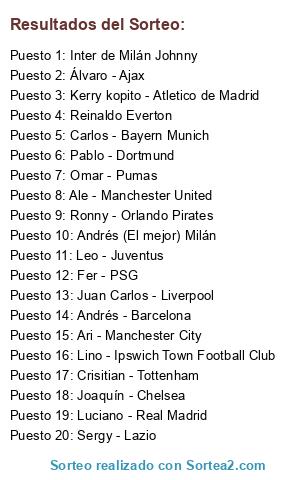 Lista de participantes: Pablo - Dortmund, Andrés - Barcelona, Carlos - Bayern Munich, Joaquín - Chelsea, Leo - Juventus, Ale - Manchester United, Omar - Pumas, Luciano - Real Madrid, Juan Carlos - Liverpool, Andrés (El mejor) Milán, Ari - Manchester City, Lino - Ipswich Town Football Club, Fer - PSG, Reinaldo Everton, Sergy - Lazio, Crisitian - Tottenham, Ronny - Orlando Pirates, Álvaro - Ajax, Inter de Milán Johnny, Kerry kopito - Atletico de Madrid.