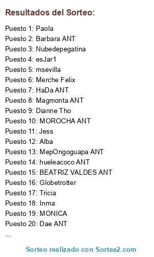 Lista de participantes: Laura F LFC ANT(2 participaciones), Raquel DonaLis ANT(2 participaciones), Nuku-Nuku ANT(2 participaciones), Brujamr ANT(2 participaciones), Alejandra ANT(2 participaciones), Lunika512 ANT(2 participaciones), Dae ANT(2 participaciones), Magmonta ANT(2 participaciones), Bethya, Saray Sierra, Trihia ANT(2 participaciones), Alba, Adrierika MakeUP, Piruleta ANT(2 participaciones), Haizeatxu, Becky Torres, ObeBlog ANT(2 participaciones), Zoe, Ilusibnchenoll, MybeautyCorner ANT(2 participaciones), Sissuka, Isa, Elgatodelpuntodecruz, Mai, Sandra xula_153, Jess, Nestheroski ANT(2 participaciones), Xinty, Creacionesjamc, TERMIXRO ANT(2 participaciones), ADRIANARTE1, AnitaMétier, Pitty, MONICA, MENSIN32, yo-2006, Tricia, Nana313, MepOngoguapa ANT(2 participaciones), Eclipse, Marikilla Detallitos ANT(2 participaciones), Maria ANT(2 participaciones), HaDa ANT(2 participaciones), Ana_lapazzesca, G.O. ANT(2 participaciones), Aralla007, Jonolun, Isamar, Yeneva, Marta Rey ANT(2 participaciones), MariJo, RoSi, Silvia, AXIA, Inma, Barbara ANT(2 participaciones), Las Cosicas de Ange ANT(2 participaciones), Msevilla, MASganchiYO, Chispitas, Noelia Soriano, esJar1, Nona Artesania, Natillas, tami, Carmen, Mi cesta de maquillaje, Nenanina, Nurya G, Anastasiaalanga, Patricia es.se, MissMargot, MOROCHA ANT(2 participaciones), BEATRIZ VALDES ANT(2 participaciones), TussecretosdebellezSaI, Heaven, Nubedepegatina, Lidia, Mª José, Missira, Nenaleti, Neda, Globetrotter, Olga, Eva Murillo, El Hada de las palabras, MeryyD, Nelida Castillo K, Izaskun, EvaGema, Lola Mine, Paola, Asun, Merche Felix, Estefania Carcas, Laura _m85, Jessi, Yosolitamemaquillo, Miavi ANT, Miavi, PURI, -=-Eilynd-=-, Quel, Flora hanna, hueleacoco ANT(2 participaciones), Tras el Secreto de venus ANT(2 participaciones), rocio cuerda, Garda Artesania, msevilla, titicreaciones, Raquel, Dianne Tho, Elenita, Celiaa23.