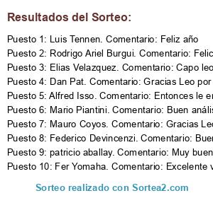 - Ganador 9: patricio aballay. Comentario: Muy buenos tus analisis!, feliz año!, donde puedo seguirte en twitter?