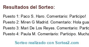 - Suplente 3: Paula M. Comentario: Participo. Muchas gracias por el sorteo. Saludos.