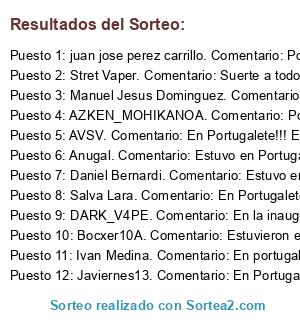 - Ganador 2: Stret Vaper. Comentario: Suerte a todos para el sorteo. Un saludo desde sevilla para todos