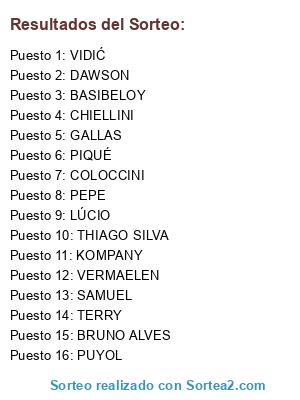 Lista de participantes: THIAGO SILVA, PUYOL, VIDIĆ, KOMPANY, TERRY, CHIELLINI, PIQUÉ, LÚCIO, PEPE, SAMUEL, VERMAELEN, COLOCCINI, GALLAS, DAWSON, BASIBELOY, BRUNO ALVES, .