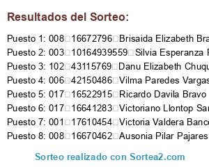 Lista de participantes: 001 74729431 Cinthia Paola Inonan Valdera, 001 16795307 Dessy Marlene Mendoza Bravo, 001 47315182 Itala Viviana Santisteban Damian, 001 75821572 Luzuet Alexandra Vasquez Hernandez, 001 17622340 Maria Felicita Valdera Bances, 001 48034441 Roxana Chafloque Tezen, 001 17610454 Victoria Valdera Bances, 002 45059564 Jose Andre Esquivel Yovera, 002 41568756 Juan Pablo Salazar Cornejo, 002 000995056 Luz Stella Ayala Sarmiento, 002 16496550 Manuel Antonio Boggio Olivos, 002 16786811 Miriam Cristina Tello Larrain, 002 41022739 Roger Franklin Barrios Lopez, 002 71993726 Yulissa Georgette Delgado Sosa, 003 16416186 Carlota Nunez Tenorio De Sandoval, 003 45470663 Carmen Rosa Asenjo Correa, 003 42510801 Carola Eugenia Montalvo Villanueva, 003 32944061 Celia Tiquillahuanca Flores, 003 42847089 Cinthia Janet Sandoval Castillo, 003 73109376 Damaris Abigail Alvarado Bustamante, 003 16673786 Flor De Maria Linares Vasquez, 003 16618458 Hilda Rosa Fernandez Bustamante, 003 27662596 Irma Neria Cruz, 003 09553026 Isela Hernandez Mondragon, 003 46591918 Maria Nohely Gil Santa Cruz, 003 17621320 Maria Ysabel Bances De La Cruz, 003 27432400 Mery Luz Lopez De Swayne, 003 16668699 Onelia Noemi Nanez Seclen, 003 17556111 Rosa Elvira Zapata Suclupe, 003 72527089 Sheyla Luzmery Puicon Vera, 003 10164939559 Silvia Esperanza Peralta Villar, 003 22288911 Sonia Emilia Cordova Granados, 003 16526598 Yolanda Jannet Nanez Seclen, 003 16456289 Zoila Victoria Garcia Cortez, 005 16754490 Elena Isabel Chira Torres, 005 27389396 Maria Nelida Lozano Vasquez, 005 73510264 Nelly Leonardo Quispe, 005 45660247 Rossy Lozano Quispe, 005 44390477 Wilder Coronel Fernandez, 005 72205225 Yessica Becerra Sandoval, 006 41759543 Sara Cueva Reyes, 008 16672796 Brisaida Elizabeth Bravo Valdivia, 008 16417994 Cecilia Emperatriz Patazca Delgadfo, 008 16716862 Edith Magaly Curo Caicedo De Gonzlez, 008 27404897 Edith Marcela Valderrama Torres, 008 41436098 Milagros Del Pilar Bravo Sanchez, 008 41237553 Noelia Maria Gonzales Sosa, 008 40966582 Veronica Quevedo Silva, 008 42445377 Zoila Jannina Camacho Montalvo, 010 46749556 Angela Paola Puemape Pantaleon, 010 16535075 Angelica Milagros Mejia Chavez, 010 74543080 Calef Torres Quiroz, 010 45464716 Jairo Daniel Salazar Montenegro, 010 16786655 Jesus Manuel Varillas Cabrera, 010 45035052 Luz Aguedely Torres Espinal, 010 75799079 Ruth Noemi Diaz Bravo, 011 44634716 Fraxila Tantalean Montoya, 011 16715635 Gladys Clemencia Linares Zarate, 011 16468264 Graciela Tarrillo Davila, 011 40495598 Hefziba Orfa Cerna Goicochea, 011 45137729 Jeinder Demetrio Febre Leon, 011 80515308 Jorge Augusto Morales Cruz, 011 74287695 Jose Nilser Diaz Fustamante, 011 48879188 Junior Vasquez Orrillo, 011 73338604 Kassandra Estefany Paredes Vidarte, 011 10166938011 Luz Elena Nunez Altamirano, 011 40546543 Magaly Janet Oblitas Caballero, 011 16724323 Maria Clarisa Alarcon Diaz, 011 74759637 Nayelly Lemania Reano Rojas, 011 42443106 Rosario Cruz Neyra, 011 40034269 Samantha Aracelli Alarcon Cruzado, 011 16670923 Tito Elias Cobenas Mora, 011 44310791 Victoria Collantes Machuca, 011 46511765 Wilmer Delgado Sempertegui, 012 74037862 Alisson Maryel Saldana Silva, 012 16782147 Ana Cecilia Salazar Siguenas, 012 16530221 Elda Miria Silva Soto, 012 40105608 Janina Maribel Gomez Malca, 012 41240935 Karla Esther Sandoval Astuchado De Men, 012 16731284 Rosa Judith Cachay Bruno, 012 43188559 Vikely Karina Centurion Sanchez, 012 47937934 Vilma Navarro Nunez, 014 72324714 Jhomily Anaclaudia Delgado Aguayo, 014 46463697 Valery Cristel Delgado Aguayo, 017 40507223 Alejandrina Zena Huancas, 017 16723420 Ana Isabel Bello Perez, 017 16543529 Consuelo Aurora Sanchez Correa, 017 45163002 Enith Manely Altamirano Gonzales, 017 16477761 Ermila Victoria Lingan Lopez, 017 75142703 Jesus Jampier Espinoza Torres, 017 75918758 Juanita Jeniffer Milian Vega, 017 48146095 Leidy Vilchez Linares, 017 19337182 Lucinda Edelvina Briceno Alvitres, 017 16690598 Luz Amelia Requejo Rios, 017 74952717 Melissa Aracely Castro Callirgos, 017 47365002 Rosario Suclupe Cherres, 017 45982196 Yaniry Maribel Callirgos Sanchez De Cast, 102 43115769 Danu Elizabeth Chuquipoma Santamaria, 102 45201053 Edith Jeanet Saldana Fustamante, 102 16410344 Luzmila Jesus Vigo Ruiz, 102 76817131 Melissa Jazmin Benites Sernaque, 102 16776798 Rodrigo Gabriel Valderrama Takayama, 105 44719784 Cintia Medalit Becerra Mendoza, 105 41415444 Hilda Rosa Delgado Ducuara, 105 43967737 Susana Diaz Ninaquispe, 105 77383780 Yessica Malca Perez, 106 76555581 Breznev Smit Rodriguez Vargas, 106 72926100 Christina Zahory Siapo Saldarriaga, 106 76730061 Roxana Rimarachin Saldana, 001 47614334 Maria Leides Villanueva Guevara, 001 75230483 Lilian Janeth Cabrejos Panaifo, 001 74985066 Zarith Geanely Ydrogo Zavaleta, 001 47641451 Diana Carolina Linan Bazan, 001 17640551 Rosaura De La Cruz De Valdera, 001 42284437 Jorge Maldonado Coronel, 001 48812232 Deysi Rivera Veliz, 002 16770188 Jackeline Del Rosario Piscoya Cruz, 002 43080848 Leydi Elena Quesquen Barreto, 002 74595959 Katherin Elizabeth Ramirez Eneque, 002 48234988 Erika Yessenia Ramirez Timana, 002 40156048 Claudia Pahola Galvez Leon, 002 16772598 Marianela Maribel Guerrero Chevez, 002 16788384 Yessica Maria Purisaca Chaponan, 003 45549583 Liliana Del Pilar Chaponan Carrasco, 003 16505237 Luz Asuncion Cubas De Contreras, 003 40290077 Angelica Maria Seclen Nunez, 003 40245683 Yenifer Del Carmen Galvez Arbulu, 003 80640715 Marita Elizabeth Granados Bances, 003 33673797 Elit Torres Zuta, 003 16634648 Neri Esther De La Cruz Lozano, 005 16641803 Mabel Margarita Carlos Suarez, 006 40092040 Jakeline Margot Gomez Tantalean, 006 42150486 Vilma Paredes Vargas, 008 40592167 Erika Del Pilar Medina Jimenez, 008 16670462 Ausonia Pilar Pajares Paredes, 008 73755582 Cristel Guadalupe Del Mil Cruzado Pisfil, 008 47085316 Merly Janeth Guevara Rangel, 008 42838259 Julia Cespedes Garcia, 011 46507112 Lucila Del Rosario Huaman Yaipen, 011 43208157 Iris Yulissa 